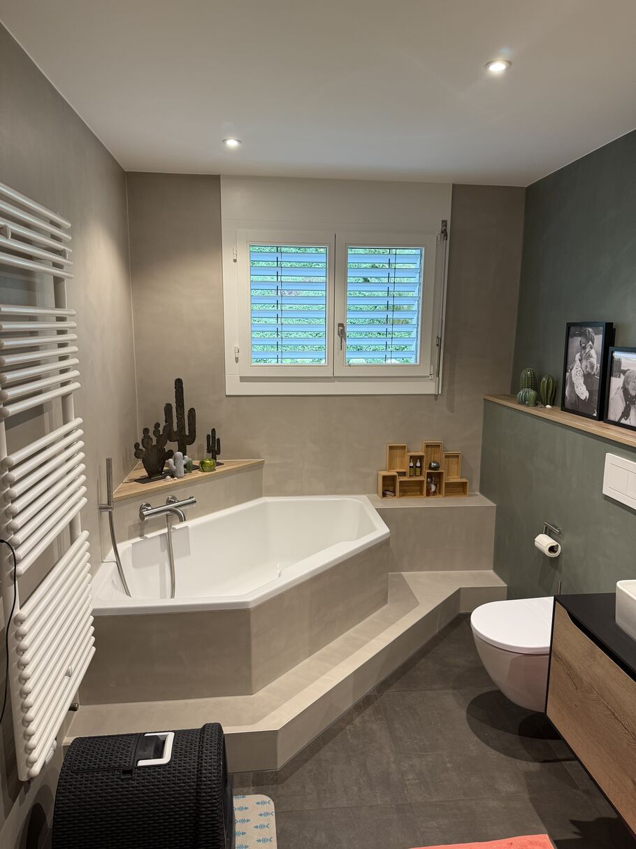 In Kerns wurden bei einem Wohnhaus aus den 90er Jahren die Küche und die Badezimmer umfangreich saniert. Die Naturafloorwände in den Badezimmern geben den Nassräumen einen wunderschönen neuen Charme. Die die neugestaltete Umgebung lädt zum gemütlichen Verweilen ein.