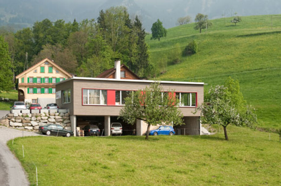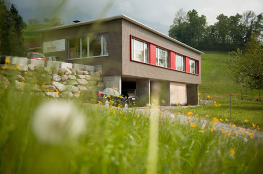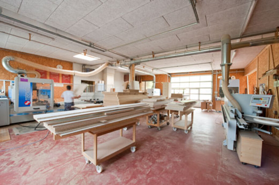 Es entstand der Anbau für die Erweiterung der Schreinerei Röthlin & Co. in der Landwirtschaftszone. Die Bedürfnisse der Schreinerei mussten mit den raumplanerischen Auflagen in Einklang gebracht werden.